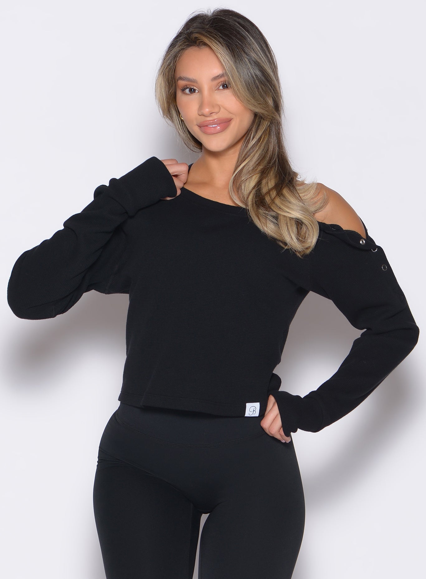 The Allure Pullover in Black is a timeless staple with a modern edge. This black waffle knit sweater features a textured knit with a flattering boat neckline for a sleek and versatile look. Snap shoulder accents and thumbholes add functional style. while the mid-length cut makes it perfect for layering. Soft and easy to wear. this black knit sweater transitions effortlessly from lounge to street. making it an essential piece for everyday comfort and sophistication.